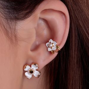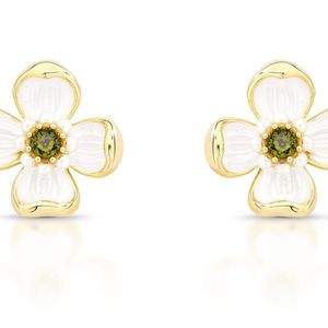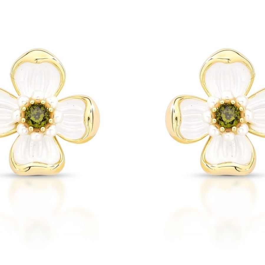 BRINCO FLOR ESMALTADA WHITE COM ZIRCÔNIA CENTRAL VERDE MUSGO E MINI PÉROLAS SHELL PINO PRATA 925