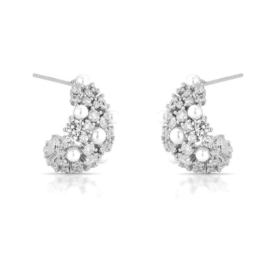 Brinco Luxo Gota Média Cravejada com Zircônias e Pérola Shell Pino em Prata 925
