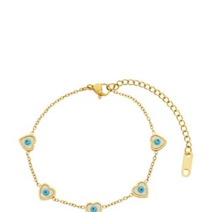 Pulseira de corações com madre-pérola e detalhe de olho grego, em aço inox dourado que não oxida e é à prova d’água. Uma peça delicada, simbólica e cheia de charme para usar como amuleto de proteção..